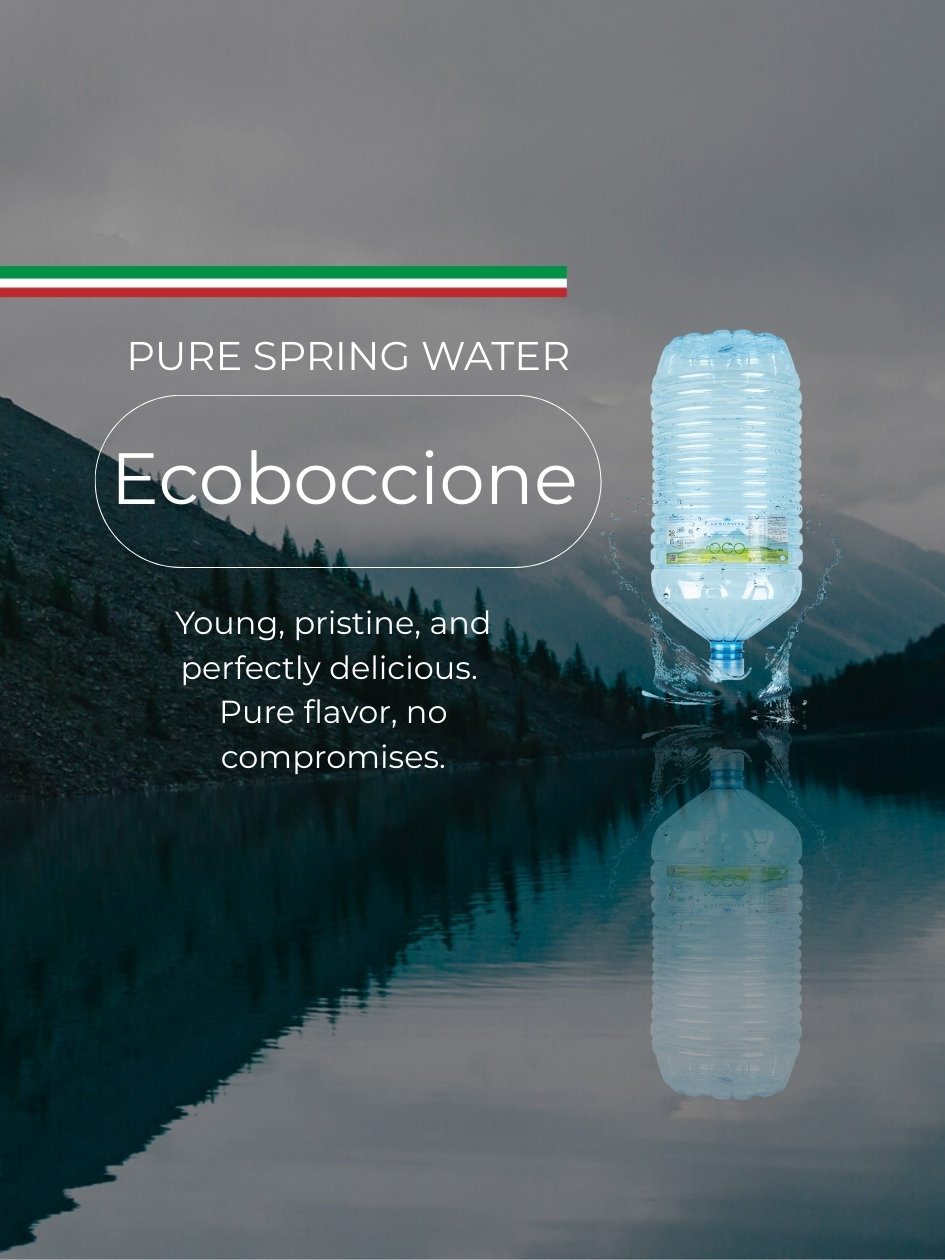 Ecoboccione water flows from Italian mountain spring sources, located far from pollution and carefully selected for their natural quality. Fresh, pure, and pleasant in taste, it preserves its natural characteristics from the source to the final use through a controlled and responsible process.